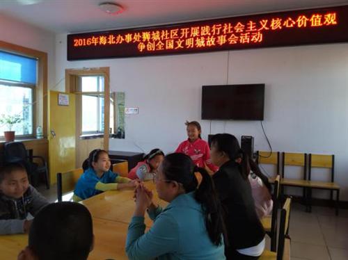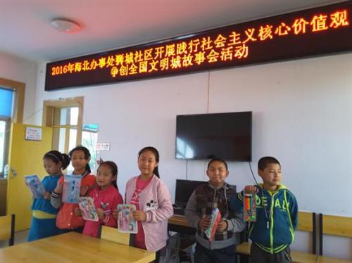 狮城社区喜迎国庆,助力创城,增加创城知晓度,推广普通话宣传,践行社会主义核心价值观的基本内容和实践要求,在学习生活中遵循践行,使社会主义核心价值观深深融入学生的思想意识、精神世界,并运用于学习生活之中。 2016年10月10日,在狮城社区二楼活动室组织辖区学生开展践行社会主义核心价值观争创文明城故事会活动,学生们积极参与,现场气氛十分活跃。