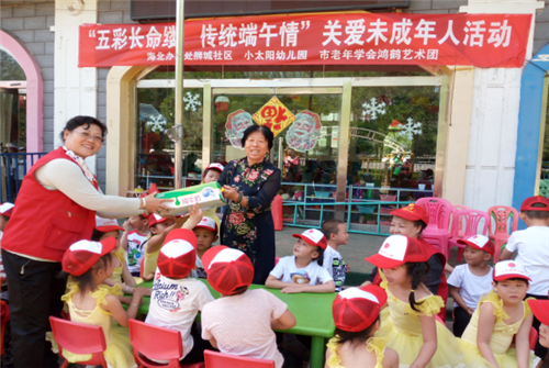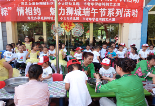 在六一、端午双节来临之际,海北街道办事处狮城社区、小太阳幼儿园、市老年学会、鸿鹤艺术团联欢举办了“老少同乐 庆六一”“粽”情相约 过端午的系列活动。5月26日上午社区居民、鸿鹤艺术团成员和幼儿园小朋友们欢聚一堂,满怀喜悦,共同庆祝六一、喜迎端午佳节。