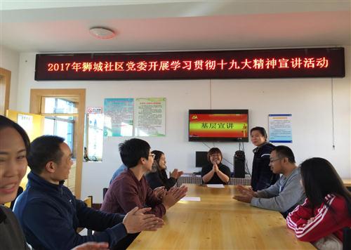 2017年11月10日,狮城社区党委组织社区党员开展“学习贯彻十九大精神”宣讲活动,社区副书记肖宁主持此次宣讲活动。