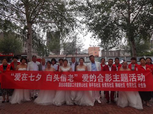 在七夕来临之际,8月10日,海北街道青山、长青东、佳苑、和平东、狮城五个社区计生协共同邀请了5对金婚夫妇开展了“爱在七夕 白头偕老”爱的合影主题活动。