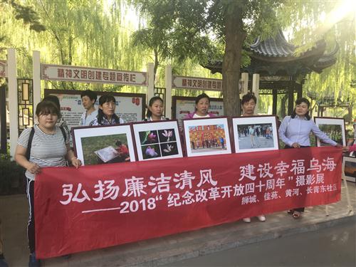 为纪念改革开放四十周年,8月23日早晨,由乌海市科学技术协会、银谷财富乌海分公司、市老年学会、海北街道办事处狮城社区、佳苑社区、黄河社区联合主办,狮城老年摄影协会和草原摄影网乌海站承办的“弘扬廉洁清风 建设幸福乌海”,“纪念改革开放40周年”摄影展览在人民公园北门广场举行。