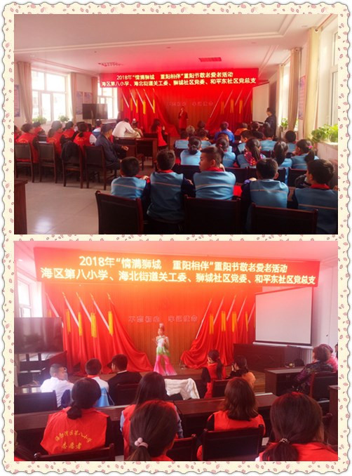 活动中由海区第八小学的学生们自编自演,通过以大合唱、诗歌朗诵、歌舞表演等形式给老人们在重阳节送来了欢乐与祝福。